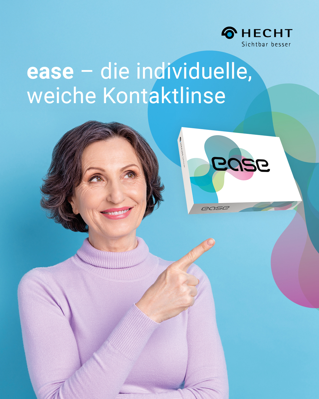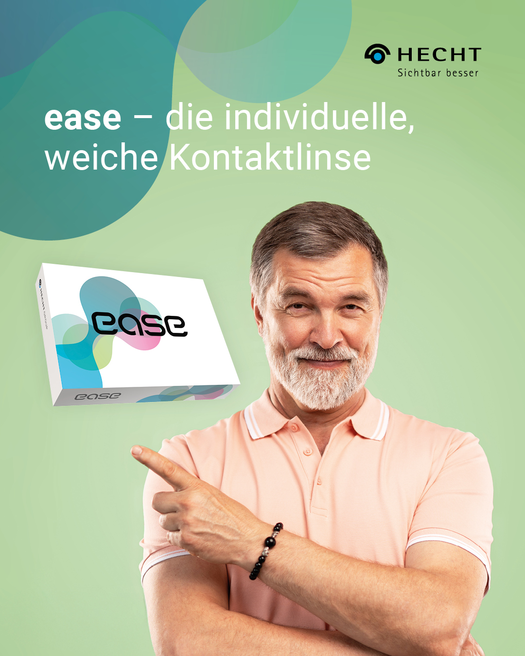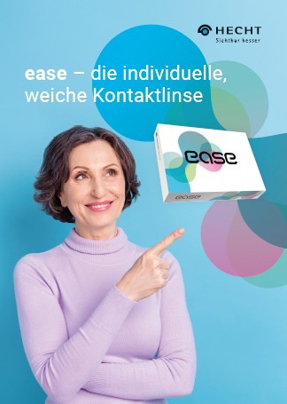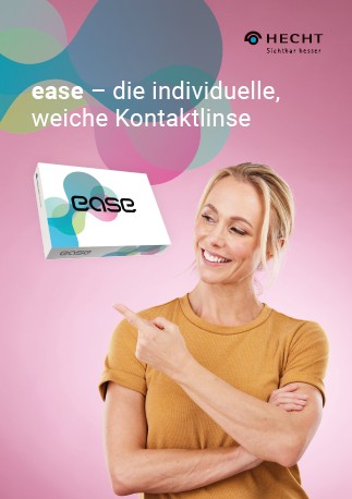 Mit ease bieten Sie Ihren Kunden ein maßgeschneidertes Kontaktlinsenkonzept, das durch exzellenten Spontankomfort und hervorragende Langzeitverträglichkeit überzeugt. Unsere individuelle, weiche Kontaktlinse stärkt Sie als Kontaktlinsenspezialist und ermöglicht eine passgenaue Versorgung. ease ermöglicht mit den Varianten sphärisch, torisch sowie multifokal und multifokal torisch zahlreiche individuelle Versorgungen. Mit höchster Präzision und Sorgfalt wird ease in unserer HECHT-Manufaktur in Deutschland gefertigt. Der geringe Verpackungsmüll sowie kurze Fertigungs- und Transportwege machen ease zu einem nachhaltigen Premiumprodukt. Sie schenken Ihren Kunden mit ease ein optimales Trageerlebnis sowie die Gewissheit, bestens versorgt zu sein. Gemeinsam schaffen wir ein neues Seherlebnis für Ihre Kunden.